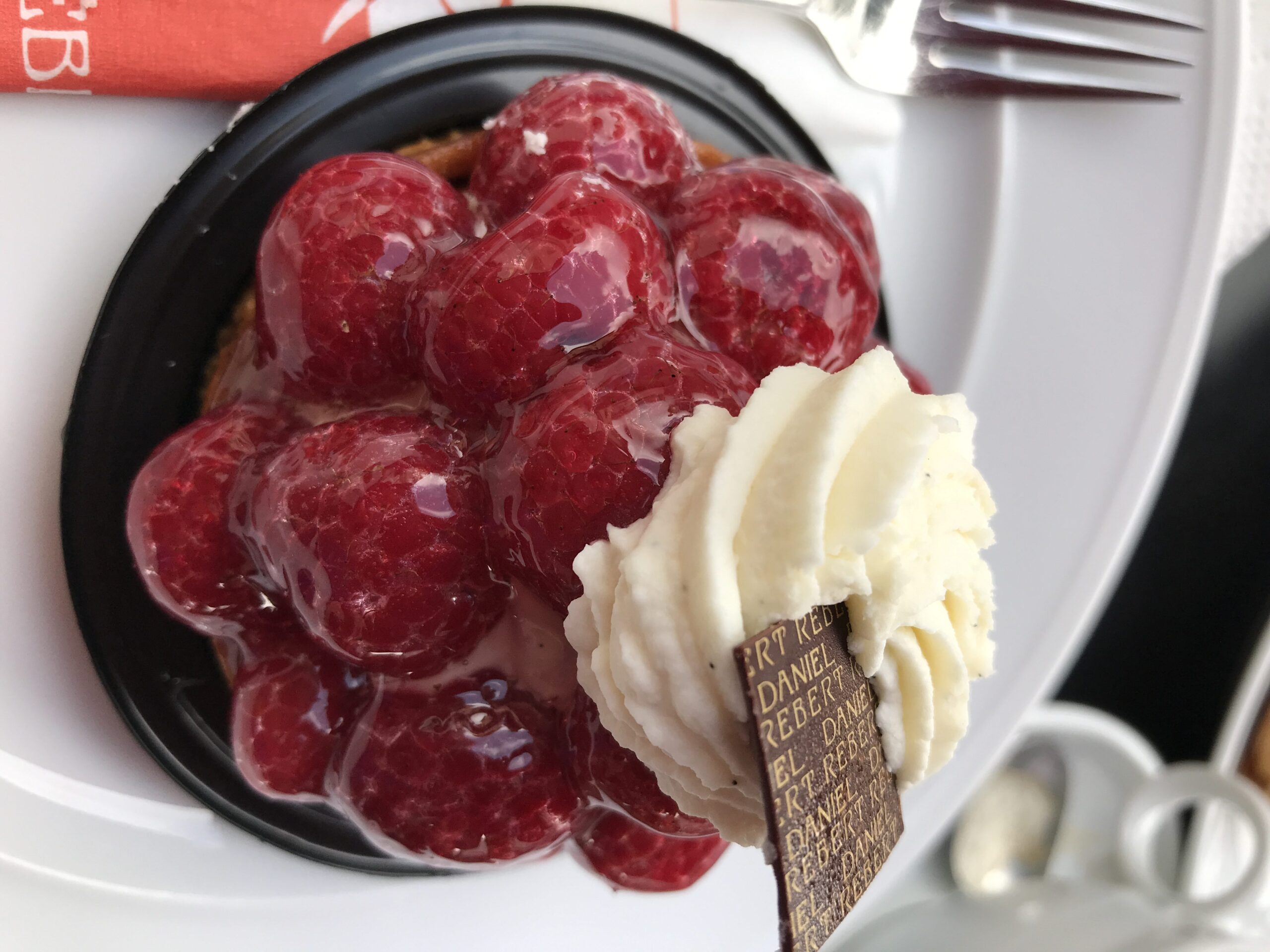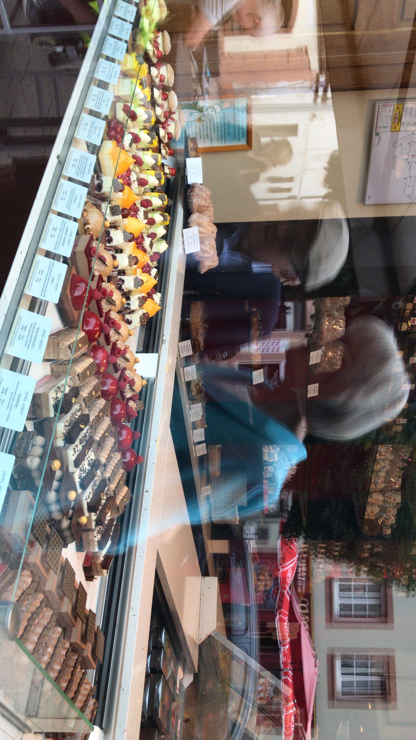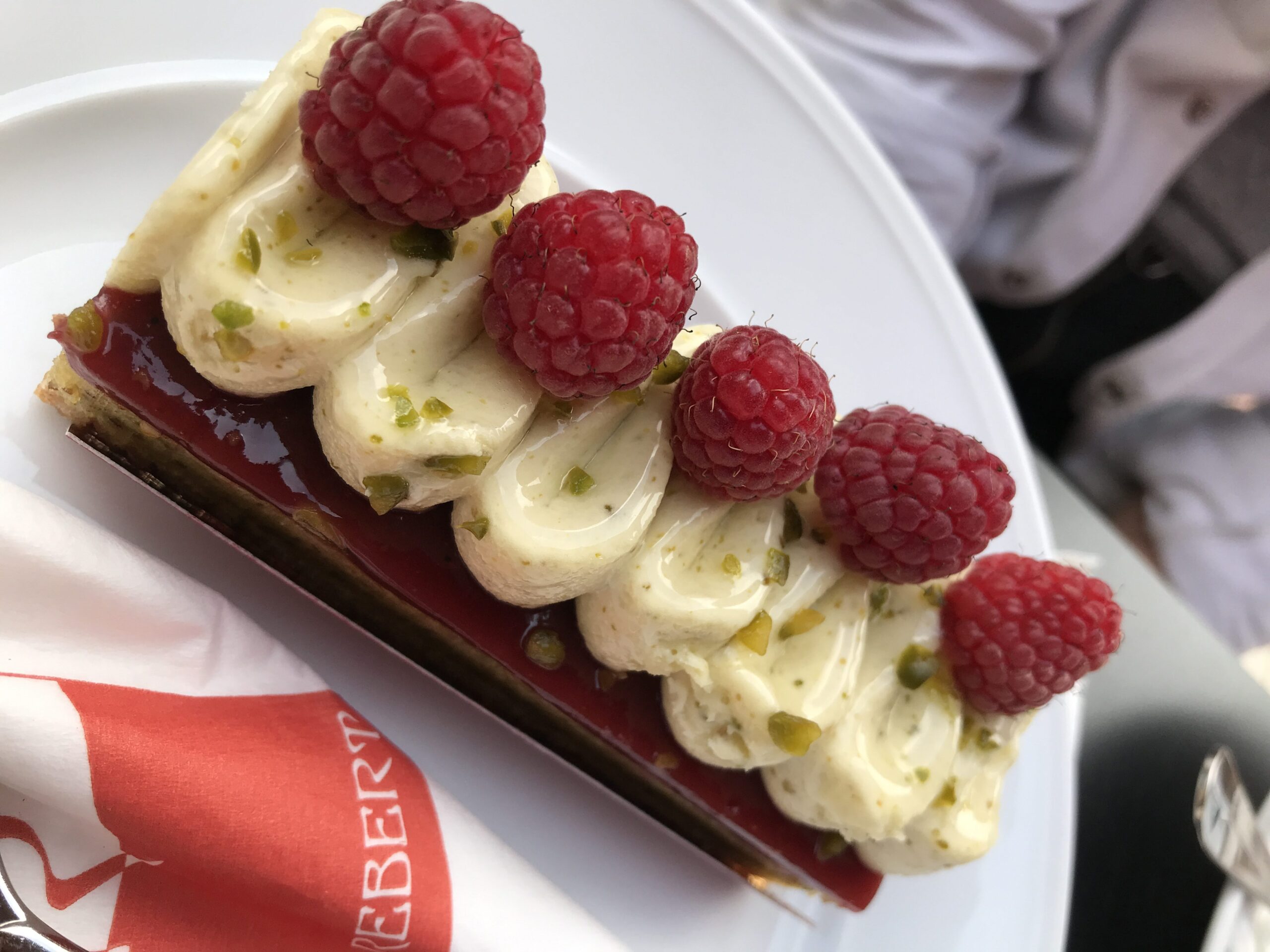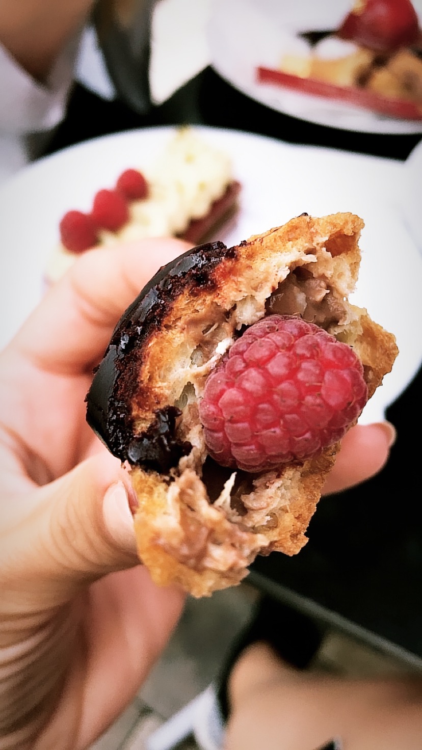 Vă spuneam că am ajuns aici pentru prima oară în 2013, tot cu mama și cu Mimi, prietena mea, iar de atunci ne-am făcut o tradiție din a vizita cofetărie de câte ori putem. Eclerele cu ciocolatăși zmeură au fost scoase din meniu între timp, dar gama de produse este foarte largă și avem de unde alege. Sau găsim întotdeauna o cale simplă de a recrea gustul primul ecler: comandăm un ecler cu ciocolată și o tartă cu zmeură, luăm zmeura decorativă și o punem în ecler. Tadaa! 🙂
